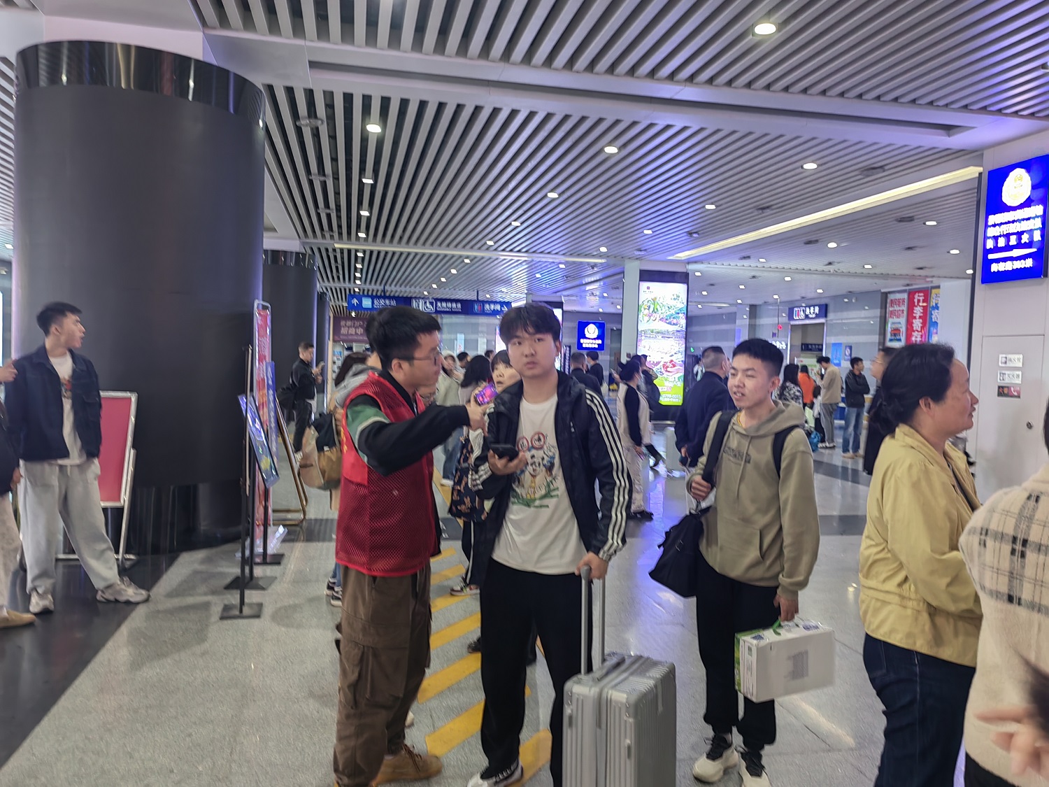在各服务站点,志愿者们一会儿化身导游,一会儿化身美食家,一会儿化身行李侠……为旅客提供周到的服务,旅客们纷纷点赞志愿者们热心、舒心、暖心!
